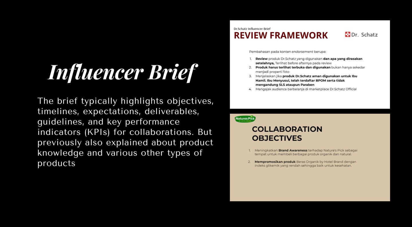 Preparing a well-structured brief will keep collaborations organized and prevent any potential misunderstandings. The influencers client's brand partner with will be aligned on what looking for, and they’ll work with to achieve a client's brand's objectives.Agency